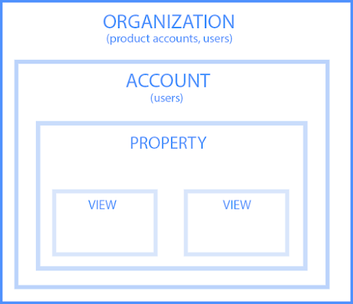 Before proceeding, you may want to know the basic structure of Google Analytics. The following figures show the hierarchy of organizations, accounts, users, properties, and views, and two structures of two Analytics accounts and in Google Analytics.